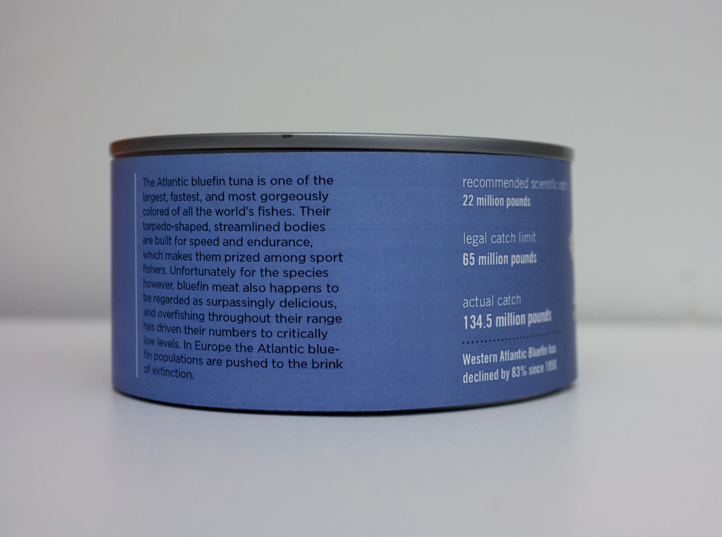 A take on the traditional tuna can by replacing all its information with little known facts about the decline in tuna populations.